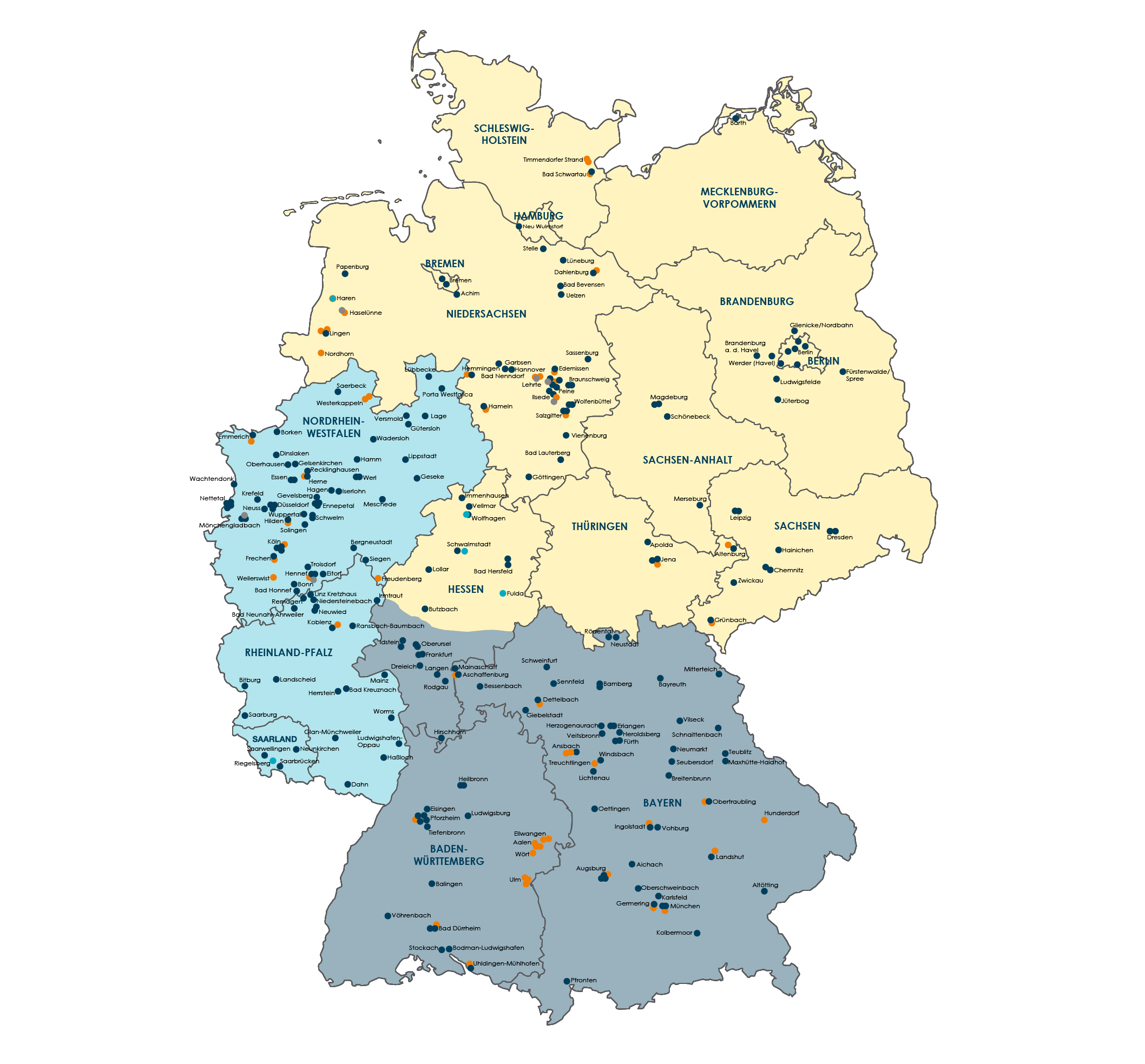 Deutschlandweit sorgen wir in rund 230 Einrichtungen, davon 65 mit betreuten Wohnangeboten und 27 Ambulanten Diensten für mehr als 30.000 Senior:innen. Du findest uns in jedem Bundesland, bestimmt auch in Deiner Nähe.