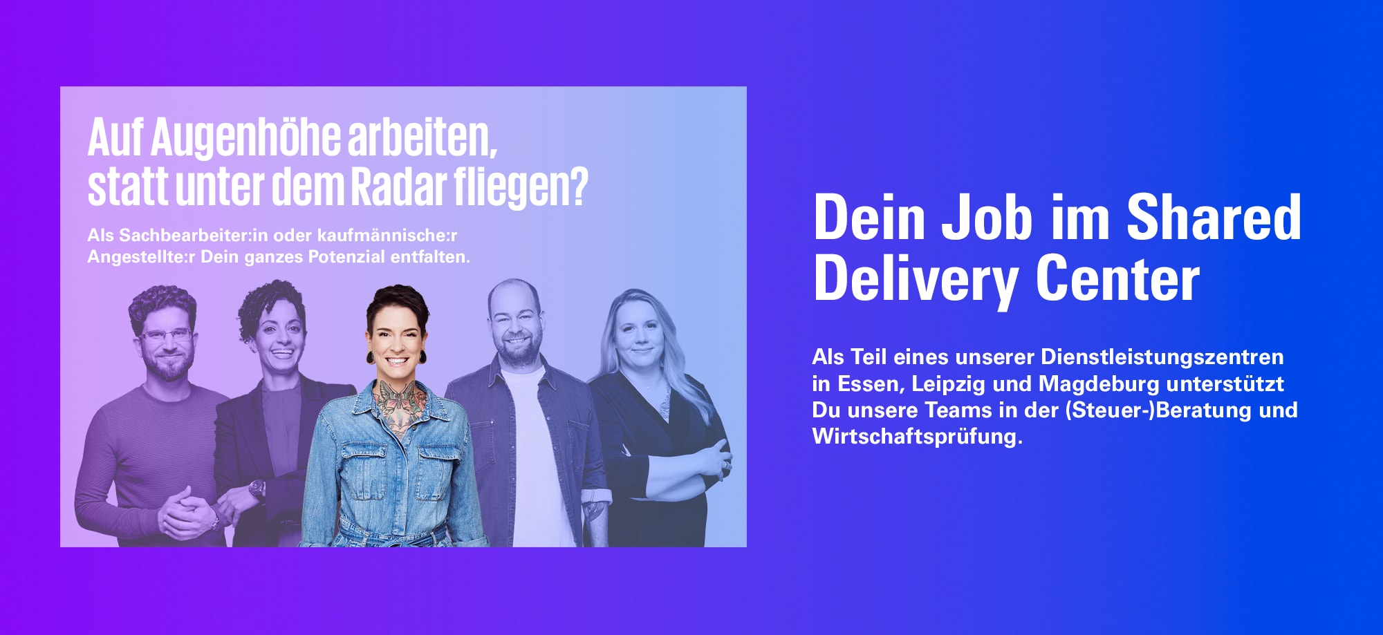 Mit Deinen Fähigkeiten leistest Du einen wichtigen Beitrag zu unseren Prüfungs- und Beratungsleistungen. Freue Dich auf die enge Zusammenarbeit mit unseren Steuerberater:innen, Wirtschaftsprüfer:innen, Rechtsanwält:innen sowie Mitarbeiter:innen in allen Zentralbereichen von KPMG.